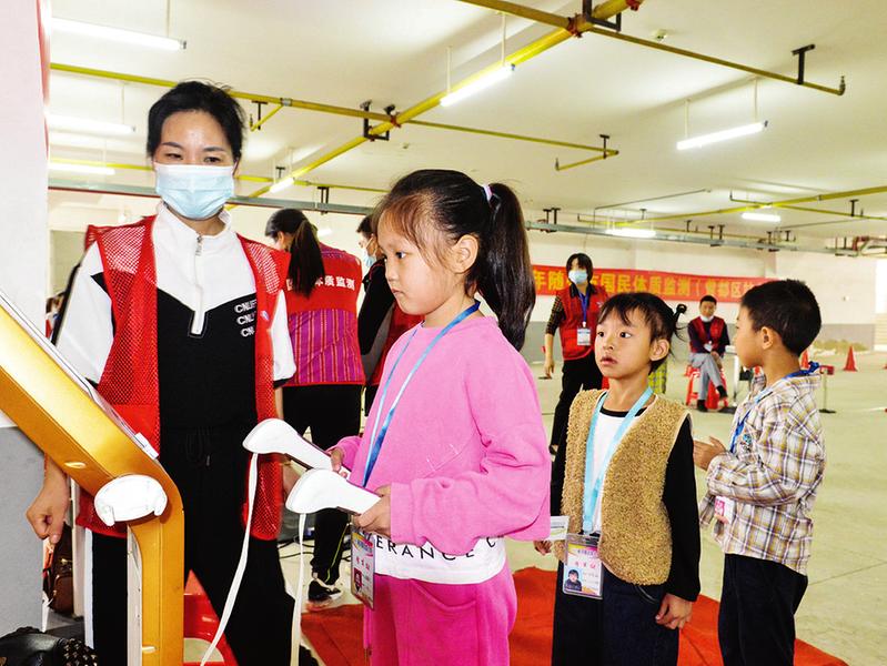 市文化和旅游局日前组织开展随州市国民体质监测活动。图为专家对随州高新区云龙小学学生身体机能、形态、素质等进行全面测试。 (随州日报全媒记者孙洪涛、通讯员王涛摄)