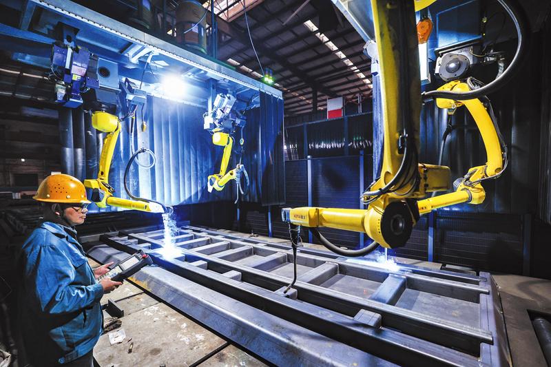 眼下,中国重汽集团湖北华威专汽公司正全力冲刺四季度目标任务。该公司通过精准定位,积极拓展国际市场,俄罗斯、澳大利亚、中东、东南亚等国家和地区出口稳中有升。图为工人正在操作4个机械臂,自动焊接自卸车箱体。 (随州日报全媒记者 李文军摄)