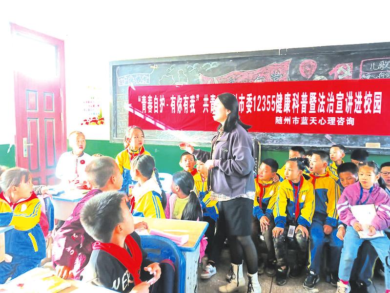 近日,随州市蓝天心理健康团代表来到府河镇涢潭中心小学开展心理健康主题教育,全面提高学生心理素质,促进学生健康成长。 (随州日报通讯员 叶小倩摄)