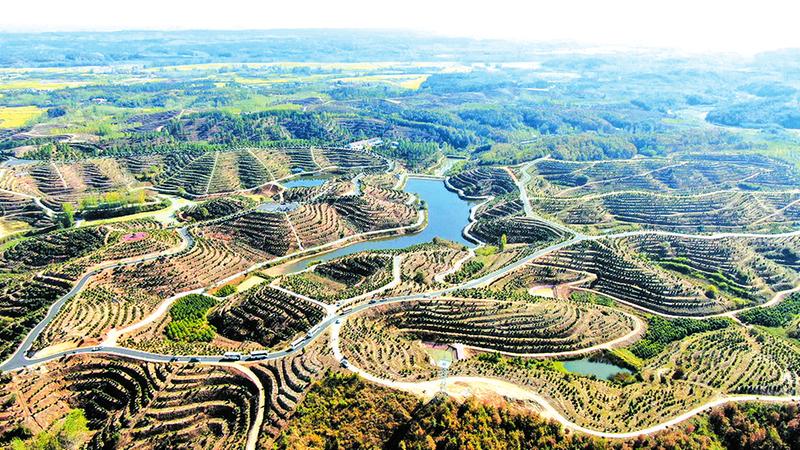 站在山顶放眼望去,“绿水青山就是金山银山”、“治理水土流失建设秀美山川”的宣传标语格外醒目。从半山腰到山谷间,一条条新建的截水沟、踏步式排水沟和一口口堰塘,引导雨水有序排放、存蓄;铺设的草坪、步道透水砖等,既有效减少了雨水冲刷水土流失,也极大改善了油茶基地生产条件和生态环境,为特色产业发展提供了有力支撑。