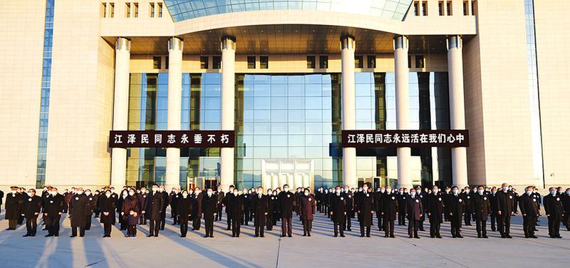 北京西郊机场国旗半垂,气氛庄严肃穆,黑底白字横幅上写着:“江泽民同志永垂不朽”“江泽民同志永远活在我们心中”。习近平和夫人彭丽媛等胸佩白花、臂戴黑纱,神情凝重地在停机坪肃立。