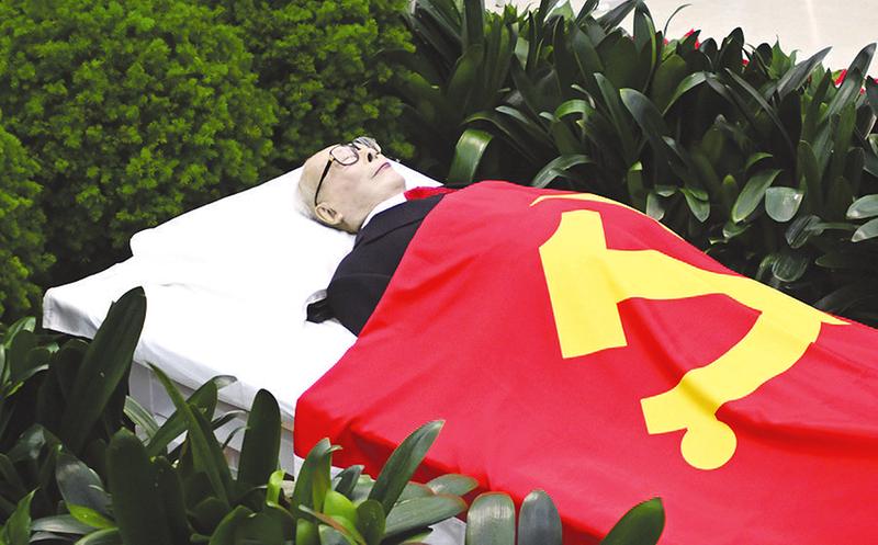 12月5日,江泽民同志的遗体安卧在鲜花翠柏丛中,身上覆盖着鲜红的中国共产党党旗。(新华社发)