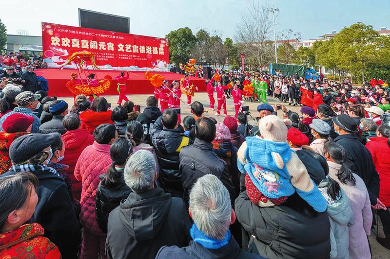 2月3日,广水市余店镇文化广场上载歌载舞、喜庆热闹。“欢欢喜喜闹元宵,文艺宣讲走基层”广水市学习贯彻党的二十大精神文艺宣讲活动在此举行。