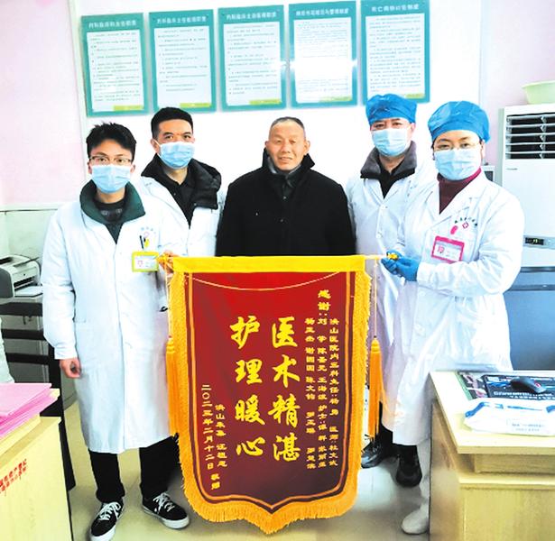 近日,随县洪山镇退休教师汪祖忠将印有“医术精湛,护理暖心”的锦旗送到随县洪山医院内三科全体医护人员手中,以示感谢和敬意。锦旗饱含医患情,彰显了患者对医院诊疗技术和服务水平的肯定。 (随州日报通讯员 赵杨 陈传兵 刘学摄)