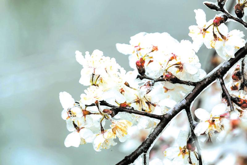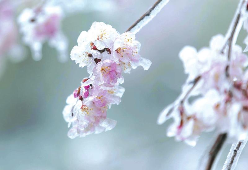 受近日低温雨雪天气的影响,山顶部分路段开放的野樱与雾凇相遇,一树树的樱花被冰凌包裹,呈现出一片片晶莹剔透的“冰樱”奇特景观,让游客直呼神奇。
