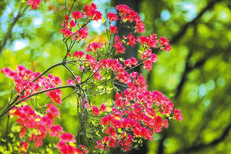 春日的大洪山尤为迷人。三、四月间,大地盎然,春的激情蠢蠢涌动,攀上树梢,樱花春情难耐,最先崭露头角,随之伸指一挥,桃、梨、李、杏、山茶……跟着起舞高歌,于是随南花海的大幕拉开了。此时,暖阳愈加温和,轻柔的山风在起伏的山间梳理着毛发一样的草木,理顺了春思。游人伴随着娇滴滴的鸟鸣,沐浴在花海中惬意无比。