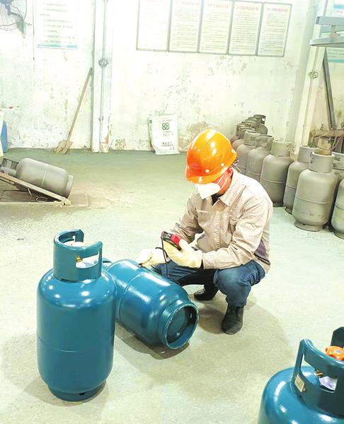 随着液化石油气瓶专项整治工作的持续开展,广大人民群众的安全意识也不断增强,湖北特检院随州分院强化服务积极推进气瓶检验,一季度检验钢瓶合格率达93%。图为检验人员正在进行液化石油气瓶壁厚检测。(随州日报通讯员王煜成、魏争光摄)