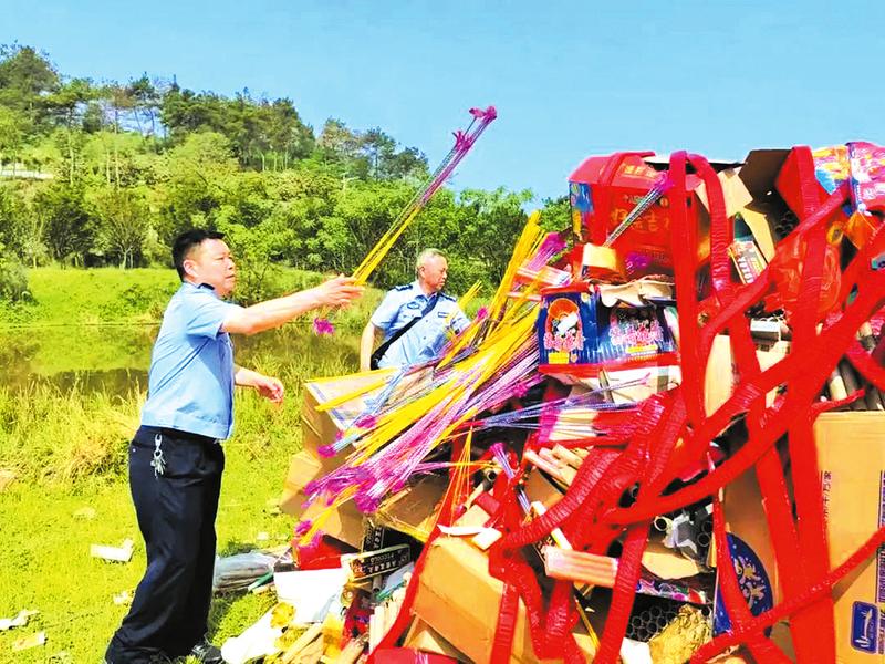 4月17日上午,广水市公安局、应急管理局、供销社协调联动,组织广水市烟花爆竹公司,对2022年以来通过“打非治违”收缴的1867件非法烟花爆竹进行集中销毁。 (随州日报通讯员 广安摄)