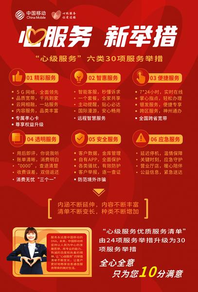 随州移动在发布“心级服务”品牌时,同步推出了“心级服务优质服务清单”,涵盖“精彩服务、智惠服务、便捷服务、透明服务、安全服务、应急服务”6大类24项服务举措。现升级为30项服务举措,增加“专属孝心卡、全国跨省宽带、尊享权益升级、远程智慧服务、消费无忧‘三个一’、防范境外诈骗”6项新服务举措。