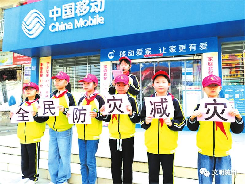 5月11日,随县澴潭镇第二小学学生化身“防灾减灾”宣传小使者,用稚嫩的身躯和嗓音进行防灾减灾宣传,这是该校在第15个“全国防灾减灾日”开展的系列活动之一,学校将“防灾减灾”宣传纵深拉伸,延至社区、街道、商区,引起民众的安全共鸣。 (随州日报通讯员 王长军 孔庆杰摄)