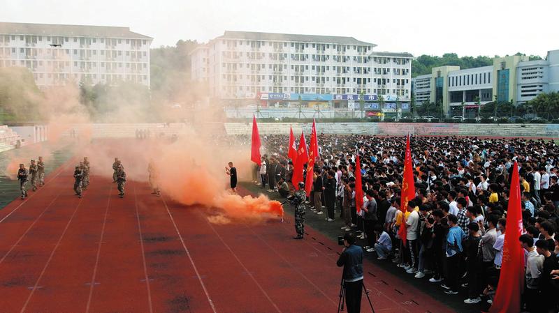 5月23日,我市在随州职业技术学院举行2023年下半年大学生征兵宣传进校园活动,通过组织学生观看队列、军体拳、刺杀操表演,宣讲征兵政策,动员青年大学生应征入伍,投身国防建设。 (随州日报全媒记者徐斌、通讯员张伟摄)
