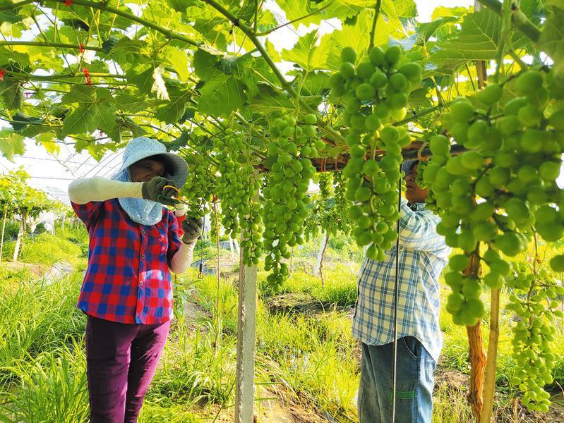 广水市李店镇飞跃村办起乡村合作公司,种下30多亩葡萄,助力农民和村集体双增收。目前该村种植的阳光玫瑰、巨峰、醉金香3个品种葡萄均长势喜人,丰收在望。图为村民们在葡萄园内剪枝、疏果。 (随州日报全媒记者 陈云摄)