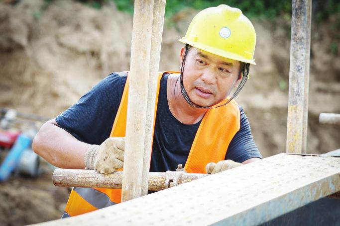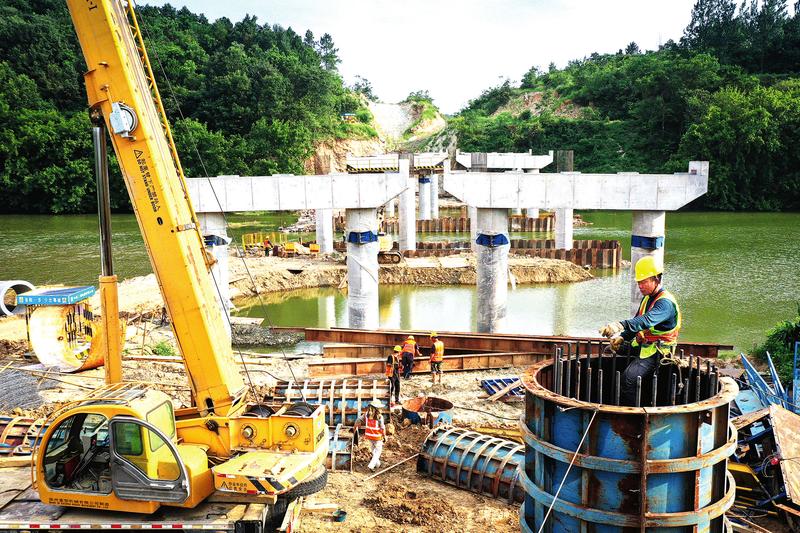 7月17日下午4时,室外气温35摄氏度,在南外环涢水大桥施工现场,吊机长臂挥舞,挖掘机来回穿梭,一片繁忙景象。桥墩上几名工人在技术员的指挥下正在进行模板调垂度,桥台上工人正忙着架设模板。在施工现场旁边的树荫下,几名工人正在吃着工区送来的雪糕。