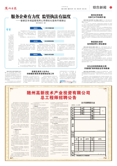 随州高新技术产业投资有限公司(以下简称“高新投公司”)是由市政府国资委履行出资人职责的市属一类国有投资平台企业。公司于2016年1月启动实质性运作,注册资本金6亿元,下设15家二级公司。