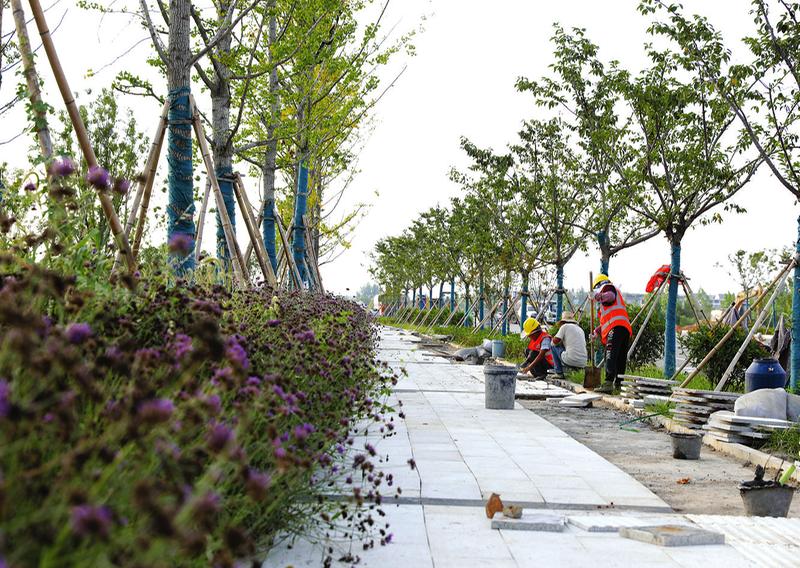 现场看到,沿河大道道路已完成约90%,工人们正在进行人行道铺装、路灯安装及部分绿化施工,两个公园正在进行园内构筑物和绿化施工。景观带上,新增上万棵乔木和21万余平方米灌被、草坪,马鞭草、紫叶狼尾草、松果菊等花草摇曳生姿,点亮整个绿带。