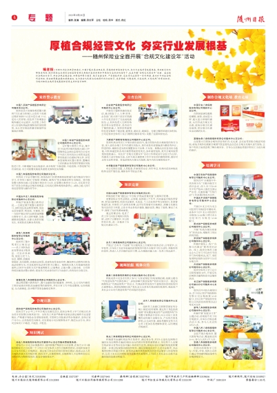 解各类风险,随州保险业在国家金融监督管理总局随州监管分局和市保险行业协会的指导下,认真开展“合规文化建设年”活动。通过组织合规培训学习、举办合规宣教活动、加强案件警示教育、做实自查自纠、严肃整改问责、突出常态治理等一系列举措,着力补齐内控合规明显短板,坚决破解屡查屡犯顽瘴痼疾,大力整治人民群众反映强烈的行业陋习,逐步构建“不敢违规、不能违规、不想违规”的有效机制,为随州保险业高质量发展提供重要支撑和坚实保障。