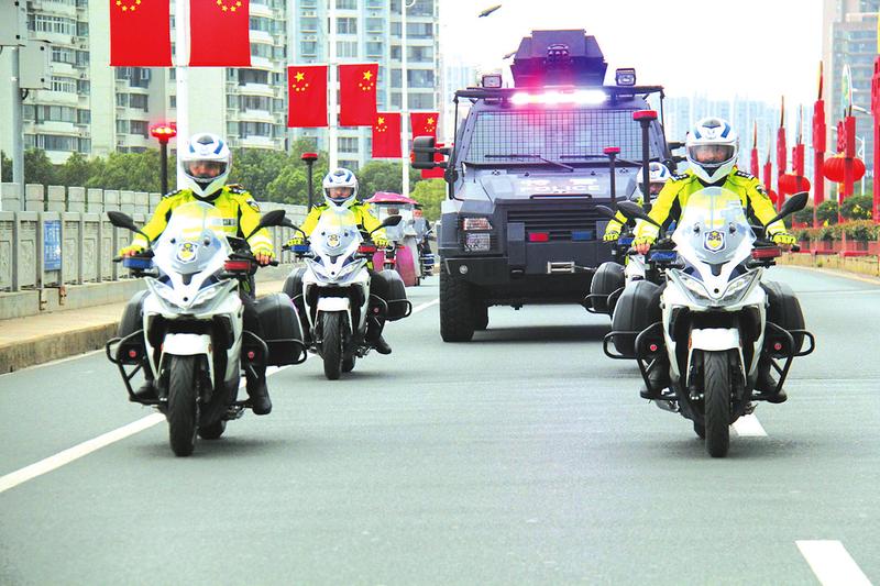 “双节”期间,市公安局特警支队民辅警驾乘警用摩托车和防暴装甲车在主城区开展巡逻防控,为人民群众平安过节营造良好的治安环境。 (随州日报通讯员刘智明摄)