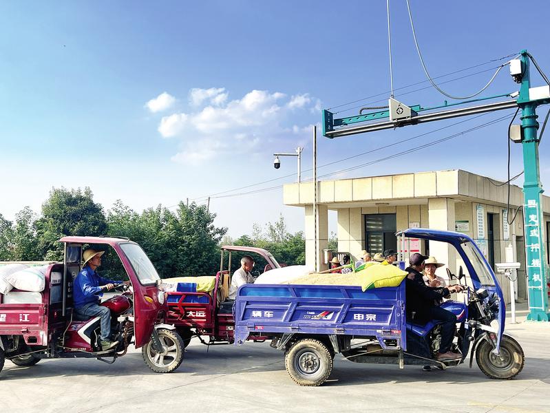 10月16日,农户们抢抓晴好天气卖粮。湖北省储备粮随州储备库有限公司优化收购流程,规范收购作业,持续提升为农服务水平,做好秋粮收购工作。 (随州日报全媒记者王聪莹摄)