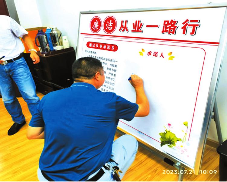组织市水利和湖泊局机关党员干部签订《廉洁从业承诺书》,严格按承诺书的承诺内容和要求,牢记初心使命,永葆政治本色,以优良的作风推动水利工作高质量发展。