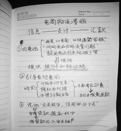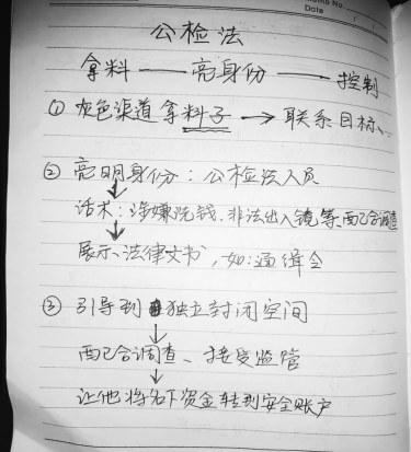 笔记里的“料子”是骗子的行业黑话,指身份证号、手机号等公民个人信息,骗子冒充公检法的工作人员联系受害人,以涉嫌洗钱、非法出入境等罪名要求配合调查,并展示虚假的法律文书,使受害人陷入恐惧,进而引导其进入封闭空间,防止与外界联系,再让受害人将资金转到指定“安全账户”。