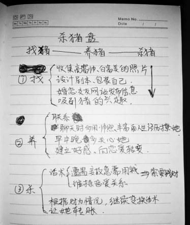 这一页写的是“杀猪盘”诈骗的作案手法,是骗子对婚恋、交友类诈骗的俗称,是指骗子把自己包装成“高富帅”或“白富美”,通过婚恋平台寻找受害人,披着爱情外衣、用甜言蜜语欺诈,进而用各种话术骗取受害人的钱财,在诈骗过程中,骗子把受害者叫做“猪”,把恋爱叫做“养猪”,把实施诈骗叫做“杀猪”。