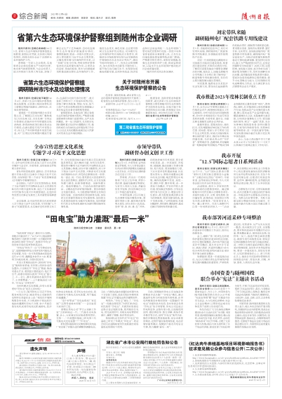 随州日报讯(全媒记者林超)12月5日,省第六生态环境保护督察组组长张歌莺、副组长史芳斌、总协调人陈同亮带队,到我市部分企业下沉调研生态环境保护工作。
