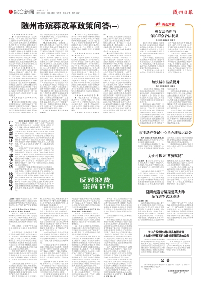 引进湖北省再生资源集团和垃圾分类及城乡环卫专业企业“江苏阳光朗洁公司”,在随县安居镇和随县盛世华源小区建立试点,按照“户分类、村收集、镇转运、县处理”的运营模式,建立城乡垃圾收运体系和环卫保洁管理体系,改造镇级垃圾转运站,建设餐厨垃圾处理中心,先后建设垃圾分类亭100处、垃圾分类房1处、有机垃圾处理车间1处、投入环卫、保洁车辆80台,分类回收废旧物资累计610吨。