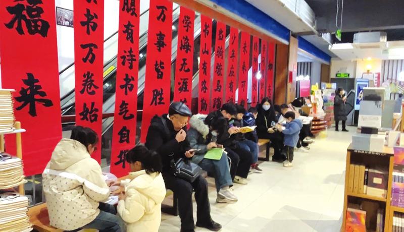 1月25日,位于随州城区大十字街的随州书城(新华书店)人来人往,很是热闹。书城二楼入口处各种有关读书的标语和春联挂满墙壁,收银台前买书的人排起了长队,各处凳子上坐满了正在看书的人。