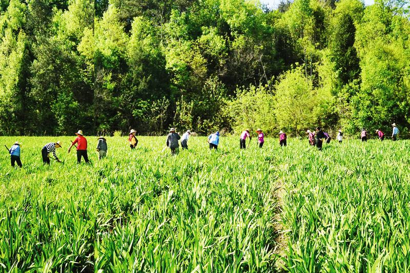 4月10日,在随县厉山镇明华社区,村民们正在中药材种植基地进行锄草、松土等田间管理。