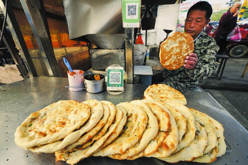广水市杨寨镇一个早餐摊主正在制作锅贴馍