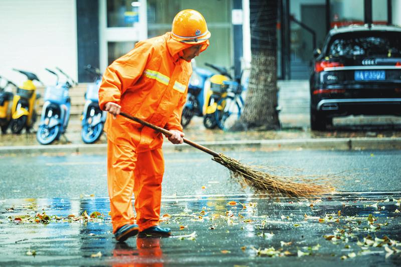 环卫工人雨后在随城解放路小十字街清扫落叶