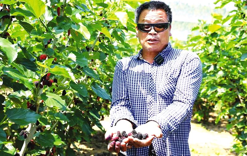 残疾果农孔四明手捧丰收的桑葚心发愁。(随州日报全媒记者 徐斌摄)