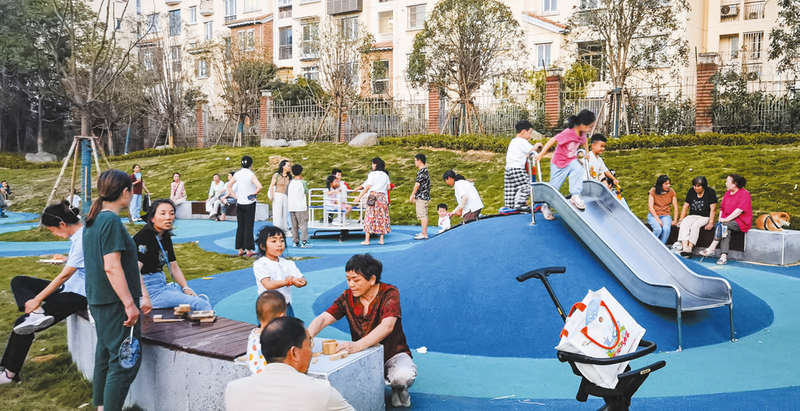 经过改造后的随城迎宾大道面貌焕然一新,一些路段新修了休闲步道、景观廊亭、健身设施及儿童游乐设施等,成为市民休闲健身的热门场所。图为6月11日傍晚,孩子们在迎宾大道碧桂园小区路段新建的儿童游乐场中尽情玩耍。