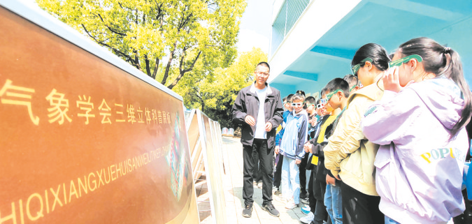 校园气象站里,孩子们认真记录着温度、湿度;科普长廊里,大家三五成群围坐在一起,讲述着身边的科普知识。