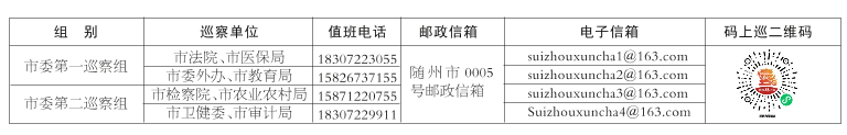 根据《中国共产党巡视工作条例》等有关规定,市委巡察组主要受理反映被巡察单位党组织领导班子及其成员、下一级党组织主要负责人的来信来电来访,重点是关于违反政治纪律、组织纪律、廉洁纪律、群众纪律、工作纪律和生活纪律等方面的举报和反映。欢迎广大党员、干部、群众按照巡察受理范围,直接或微信扫码“荆楚码上巡”小程序向市委巡察组反映有关情况和问题,鼓励实名举报。