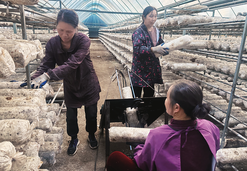 在石庙村香菇种植基地大棚内,村民们默契配合为码放整齐的菇棒打孔。(全媒记者黄芳芳摄)