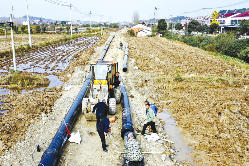曾都区全域农村供水项目一期工程管网铺设正忙。该项目覆盖3个镇,连通两座水库与两个水厂,竣工通水后将极大改善农村供水条件。图为11月16日,何店镇金花岭村施工场景。