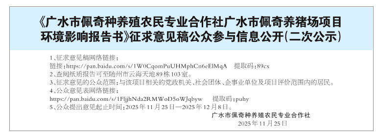 《广水市佩奇种养殖农民专业合作社广水市佩奇养猪场项目环境影响报告书》征求意见稿公众参与信息公开(二次公示)