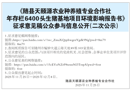 《随县天颐源农业种养殖专业合作社年存栏6400头生猪基地项目环境影响报告书》征求意见稿公众参与信息公开(二次公示)