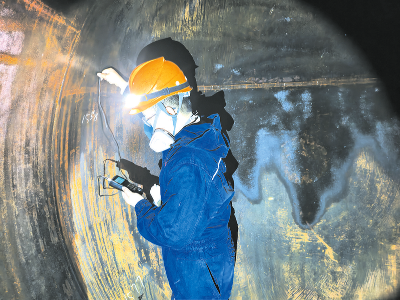 日前,湖北特检院随州分院高效开展辖区液化石油灌装站地埋压力容器检验工作,为千家万户的新春用气安全筑牢“防火墙”,让居民温暖安心过节。图为分院检验员在地埋储罐内排查储罐本体硫化氢应力腐蚀、变形、焊缝裂纹等隐患。 (随州日报通讯员 兰光健摄)